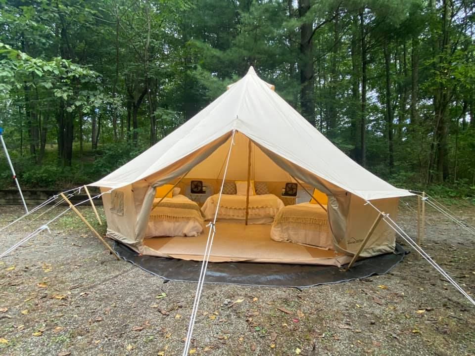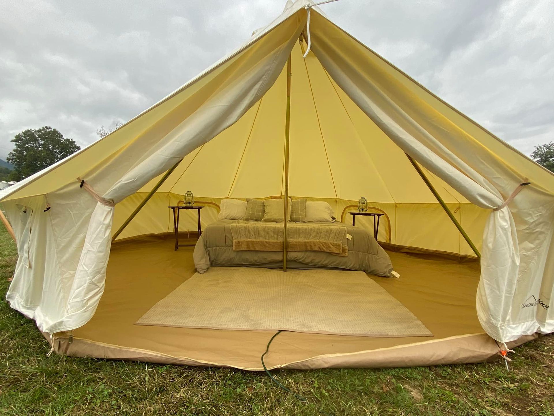 Includes - Three (3) Nights, Large and spacious 16 Foot Bell Tent, Three Twin Beds, Night Stands, Rugs, Throw Pillows, Sheets, Comforters, Throw Blankets, Décor', LED Lanterns, (2) Battery Powered Fans.