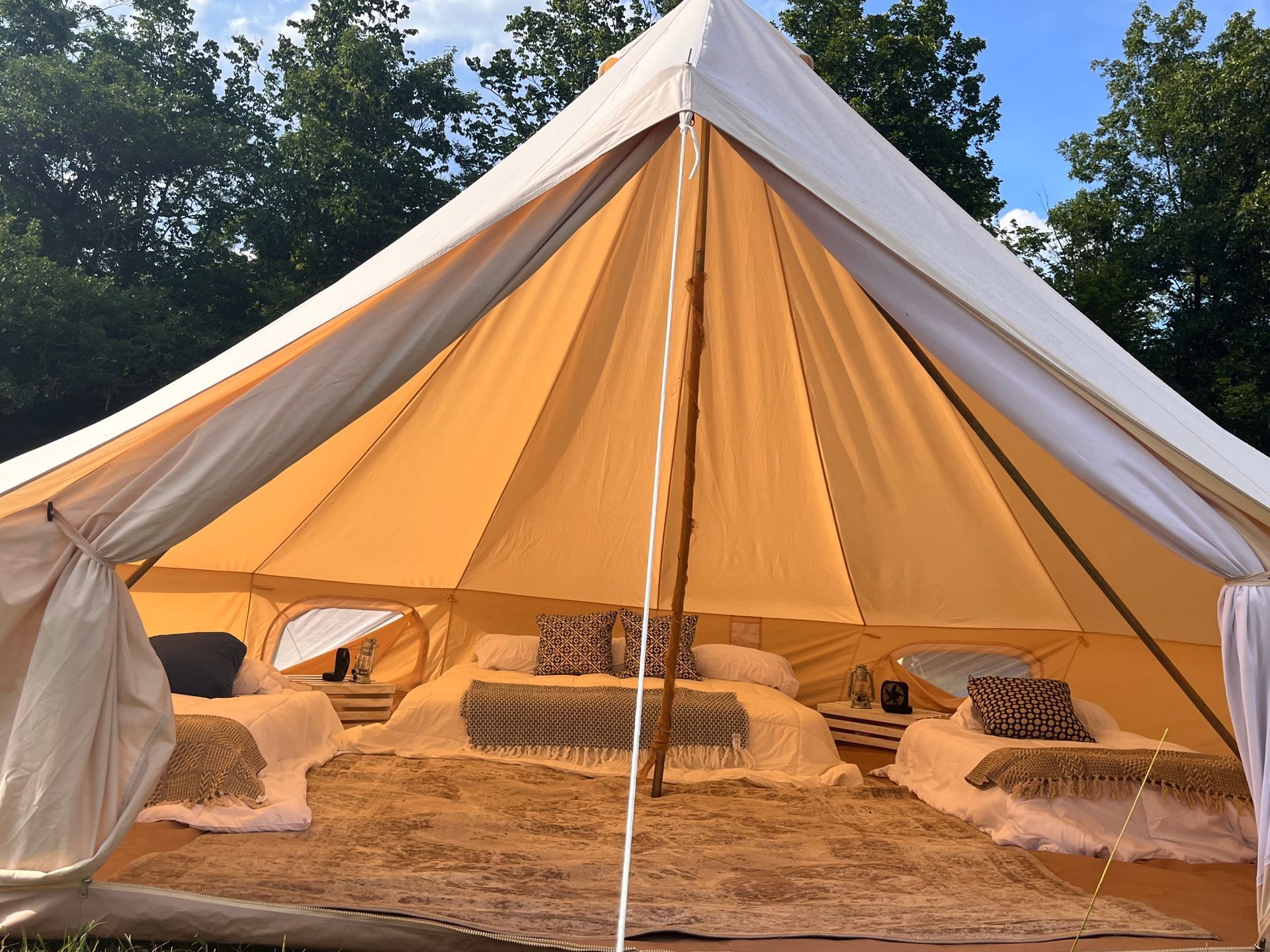 16 Foot Bell Tent, King Bed, Nightstands, Rugs, Hospitality Tent with morning coffee, Throw Pillows, Sheets, Comforters, Throw Blankets, Décor, LED Lanterns, (2) Battery Powered Fans, Charging Station Available from 8:00 am to 5:00 pm