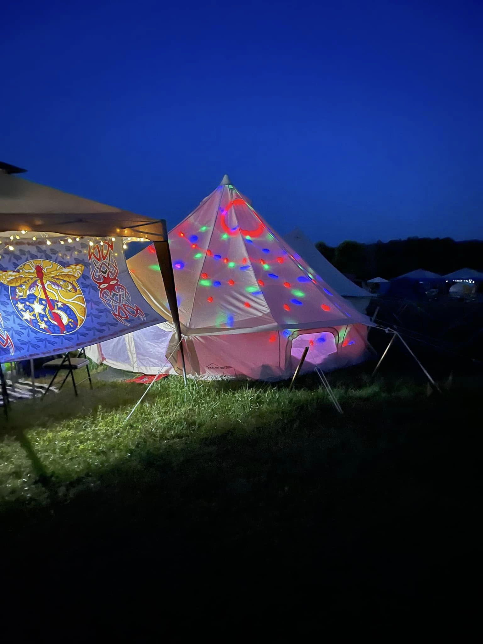 Includes - Three (3) Nights, Three Person "Camping Tent" (not one of our bell tents) with Canopy, two cots, two sleeping bags, two pillows, LED Lanterns, (2) Battery powered fans, charging station, hospitality area. Early Check In Available through the festival to add a fourth night of glamping at no additional charge.